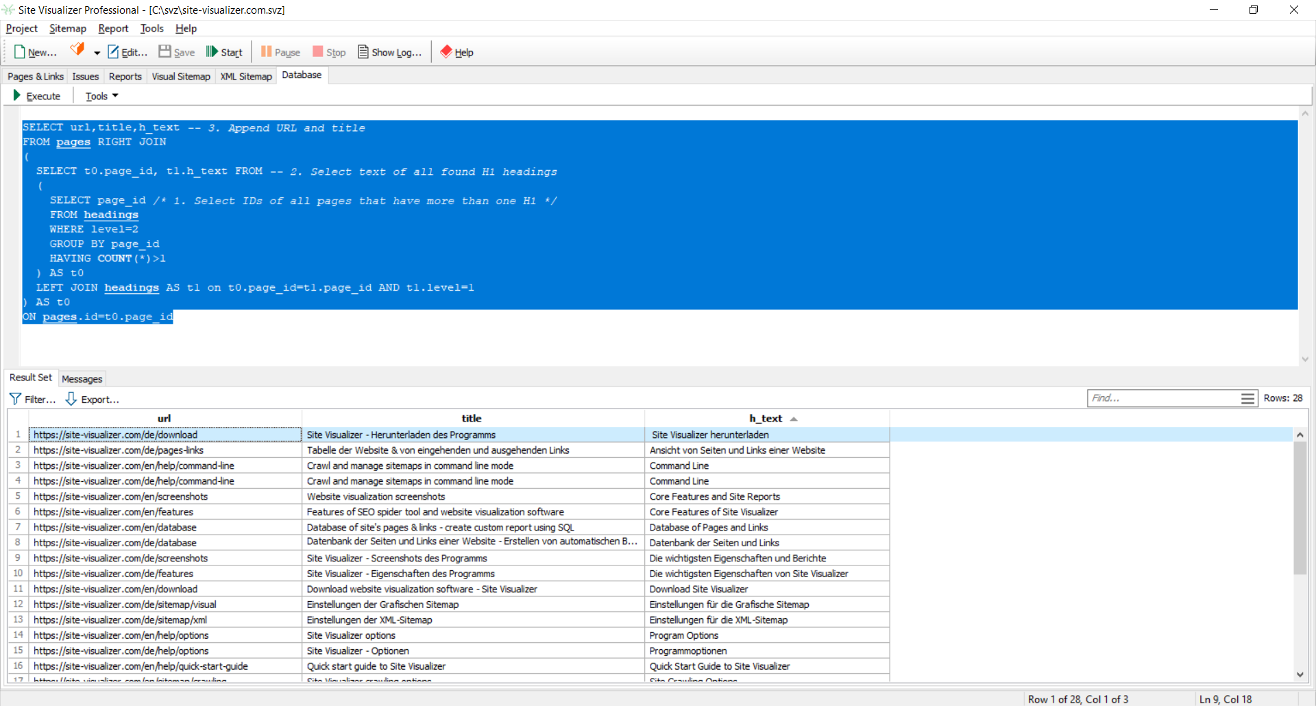 Finally, to quickly find the page (to remove or fix duplicate headings), append the page's URL and title text from the Pages table. Wrap the above statement again (nested queries), and here is the resulting query: