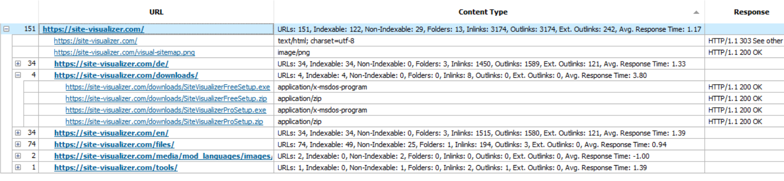 By default, the website's pages data are presented in a List view. Click the Tree button in order to build a tree of folders and pages the website consists of. At the left of a folder is the number of URLs the folder contains. The Content Type column of a folder contains its information: number of URLs, subfolders, links, etc.