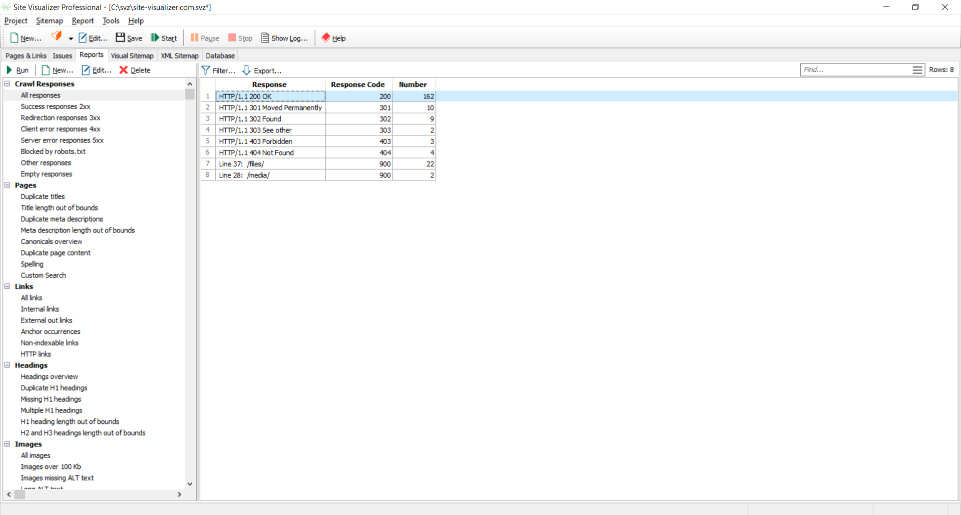 This group of reports allows you to see a server response on each requested URL. While crawling, Site Visualizer checks every link that was found on the website: regular <A> links, references to images and other files, as well as links to other domains (external links). To execute a response report, double-click it.