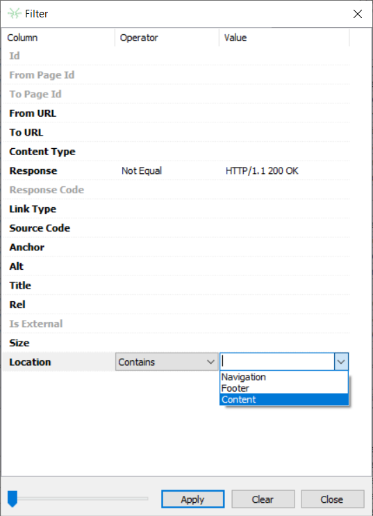 Near the coulmn you need to filter by, select an operator from the list. Contains, Equal, Not Equal, Less, Less or Equal, Greater, Greater or Equal operators are available. In the last field Value type or select a value to be used. You can filter by a several columns at once: