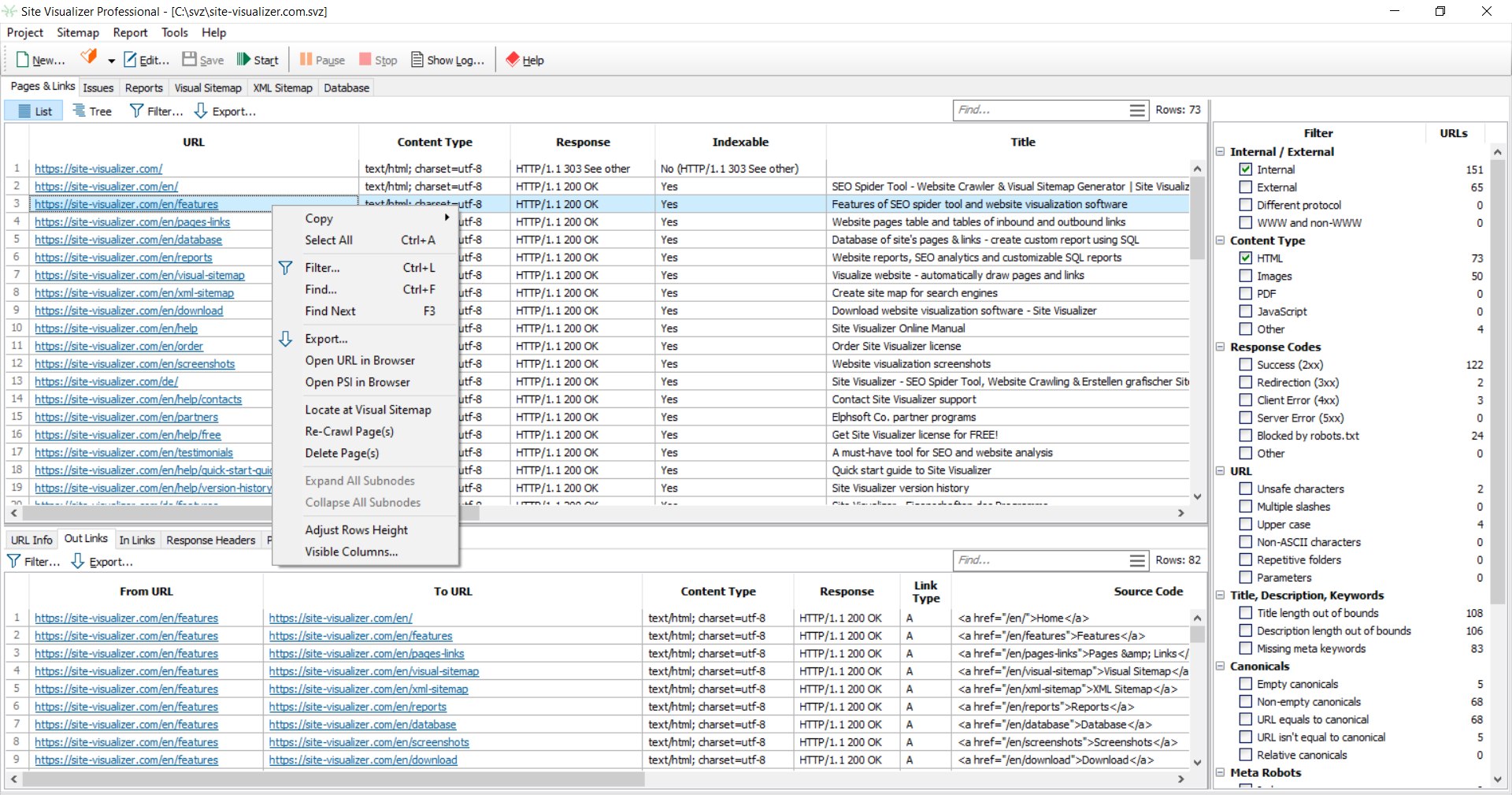 - Re-Crawl Page – allows you to update current page info, its inbound and outbound links without crawling of the whole website.