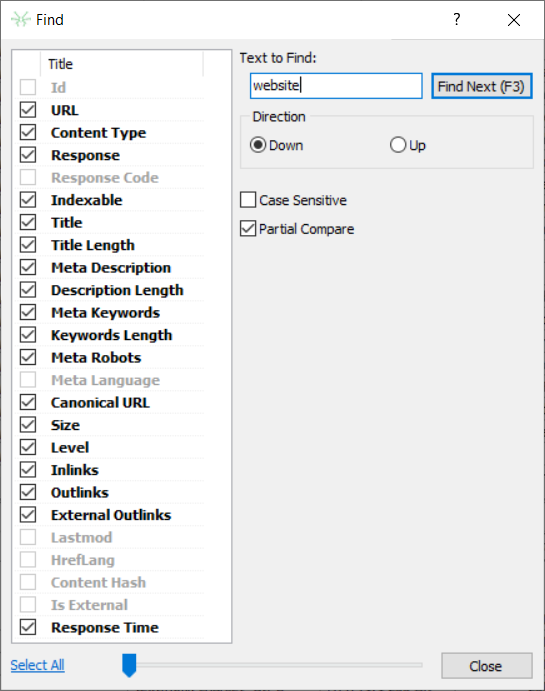 Use the Direction radio button in order to change search direction. Case Sensitivity and Partial Compare are the search options. Move the slide block at the bottom of the dialog window in order to change its transparency.