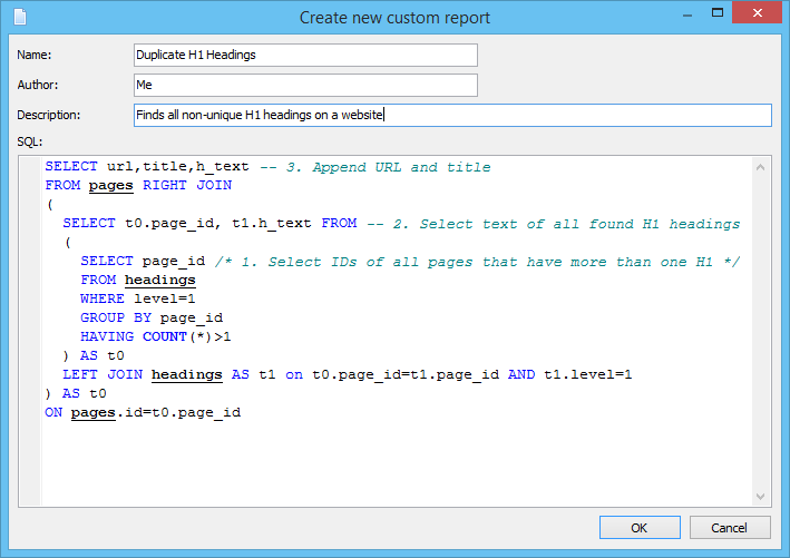This unique feature allows you to create your own report: you're able to count any information you need in any point of view related to on-page SEO. The only two things you'll need are knowledge of SQL and Site Visualizer's database.